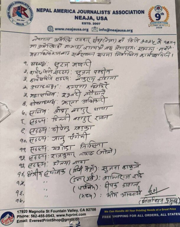 अमेरीकाको लास भेगसमा सम्पन्न निर्वाचनबाट नेतृत्वमा आउनेहरुमा कार्यसमिति सदस्यमा सुरज पण्डित र बाबुराम दाहाल, उपाध्यक्षमा कल्पना घिमिरे, महासचिवमा इश्वरी न्यौपाने, कोषाध्यक्षमा झरणा अधिकारी, सचिवमा शंकर बहादुर थापा रहेका छन् ।