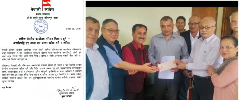 ललितपुर निवासी अमिरमान अमात्यको नाममा रहेको सो जग्गा र घर नेपाली कांग्रेस केन्द्रीय कार्यालयले खरिद गर्ने गरी मिति २०८२ असार ११ गते महामन्त्रीद्वय गगनकुमार थापा, विश्वप्रकाश शर्मा र कोषाध्यक्ष उमेश श्रेष्ठको उपस्थितिमा जग्गा धनीसँग एक वर्षभित्र पास गर्ने गरी ५० लाख रुपैयाँ बैनासहित सम्झौता भएको विज्ञप्तिमार्फत् जनाइएको छ ।
