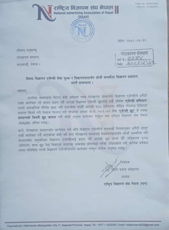 राष्ट्रिय विज्ञापन संघ (नान)ले गोरखापत्र संस्थानले विज्ञापन प्रकाशनमा दिने १५ प्रतिशत एजेन्सी छुटलाई एजेन्सी कमिसन भन्दै त्यसमा काट्दै आएका टि.डि.एस. प्रति असन्तुष्टि जनाउँदै त्यसको खारेजीको माग गरेको छ ।