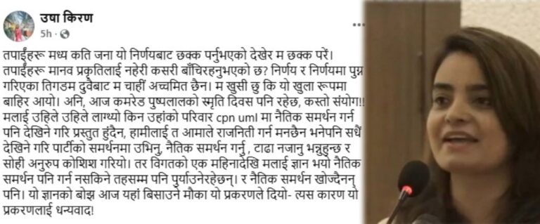 उषाले आफूहरूलाई आमाले राजनीति गर्न मन छैन भने पनि सधैँ देखिने गरी पार्टीको समर्थनमा उभिन भनेको स्मरण गरेकी छिन् । उनले लेखेकी छन् –‘हामीलाई त आमाले राजनीति गर्न मन छैन भने पनि सधैँ देखिने गरी पार्टीको समर्थनमा उभिनु, नैतिक समर्थन गर्नु , टाढा नजानु भन्नुहुन्छ र सोही अनुरुप कोसिस गरियो । तर, विगतको एक महिनादेखि मलाई ज्ञान भयो नैतिक समर्थन पनि गर्न नसकिने तहसम्म पनि पुर्याउनेरहेछन् । र, नैतिक समर्थन खोज्दैनन् पनि । यो ज्ञानको बोझ आज यहाँ बिसाउने मौका यो प्रकरणले दियो । त्यस कारण यो प्रकरणलाई धन्यवाद !’