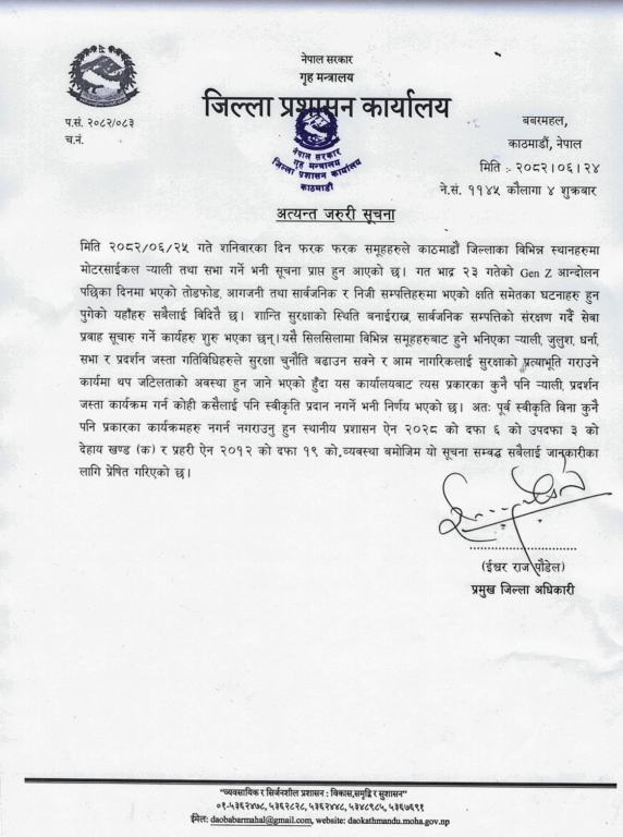 गत भाद्र २३ गतेको Gen Zआन्दोलनका क्रममा तोडफोड, आगजनी तथा सार्वजनिक र निजी सम्पत्तिहरुमा भएको क्षति समेतका घटनाको स्मरण गराउँदै आम नागरिकलाई सुरक्षाको प्रत्याभूति गराउन त्यस प्रकारका कुनै पनि र्याली, प्रदर्शन जस्ता कार्यक्रम गर्न रोक लगाईएको सूचनामा उल्लेख छ ।