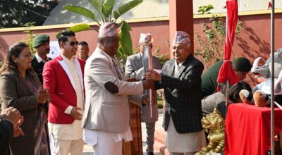 राष्ट्रपति रामचन्द्र पौडेलले १३ औं किन्डर ओलम्पिकको मस्कर्टको अनावरण गर्नुका साथ ओलम्पिक टर्च हस्तान्तरण गरेका